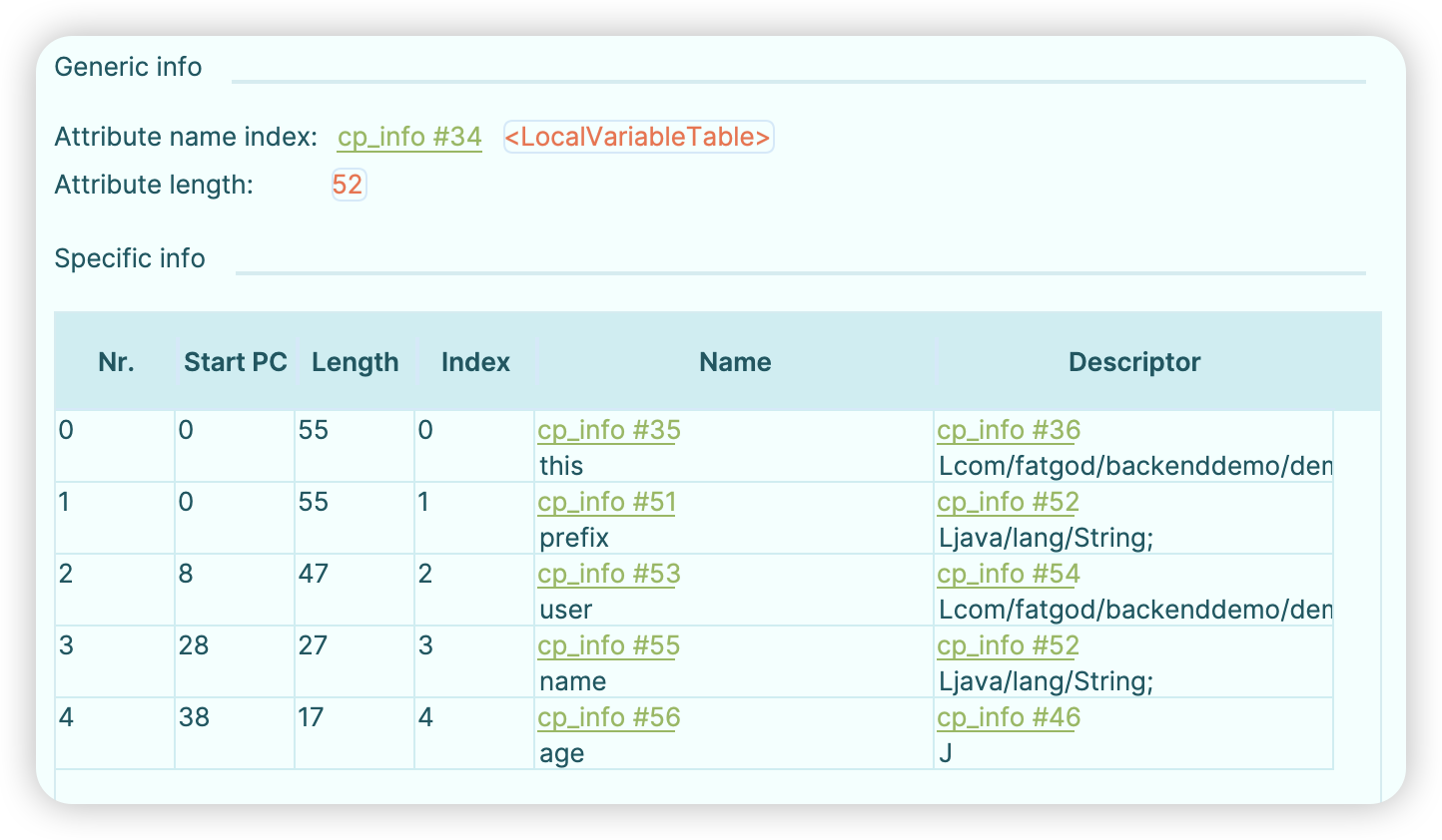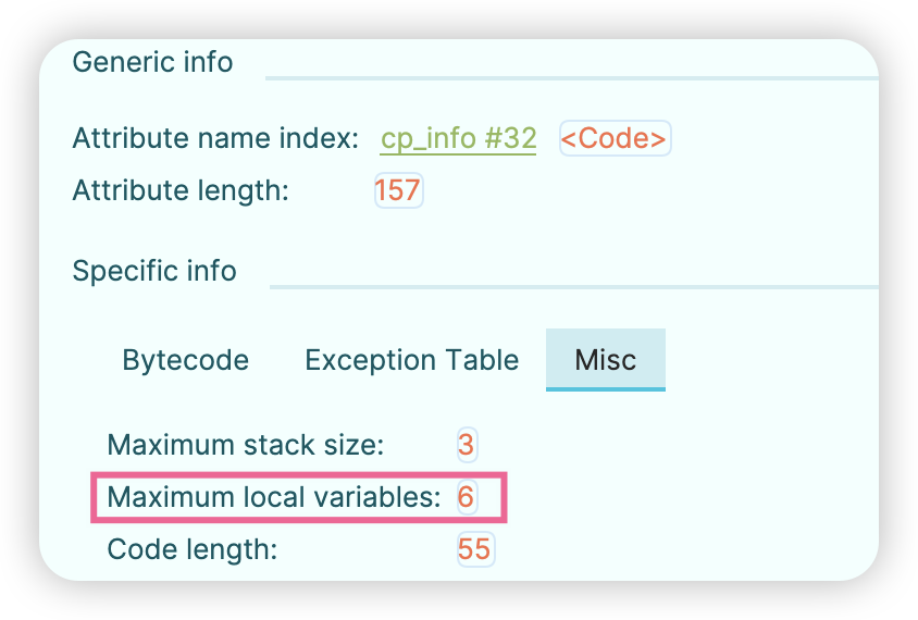 此外,字节码信息的方法部分还包括一个局部变量表的记录,编译器通过分析这个字节码中的局部变量表来确定最大槽数,而JVM在运行时创建的局部变量表数组也是基于它构建的。