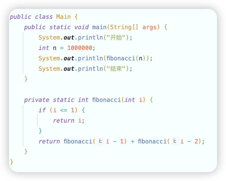 在上述代码中,我们需计算的斐波那契数n的值比较大,方法递归的深度过深,最终Java虚拟机栈中存储的帧大小总和将会超出了最大空间限制,导致无法再创建新的帧,从而引发 StackOverflowError 错误。