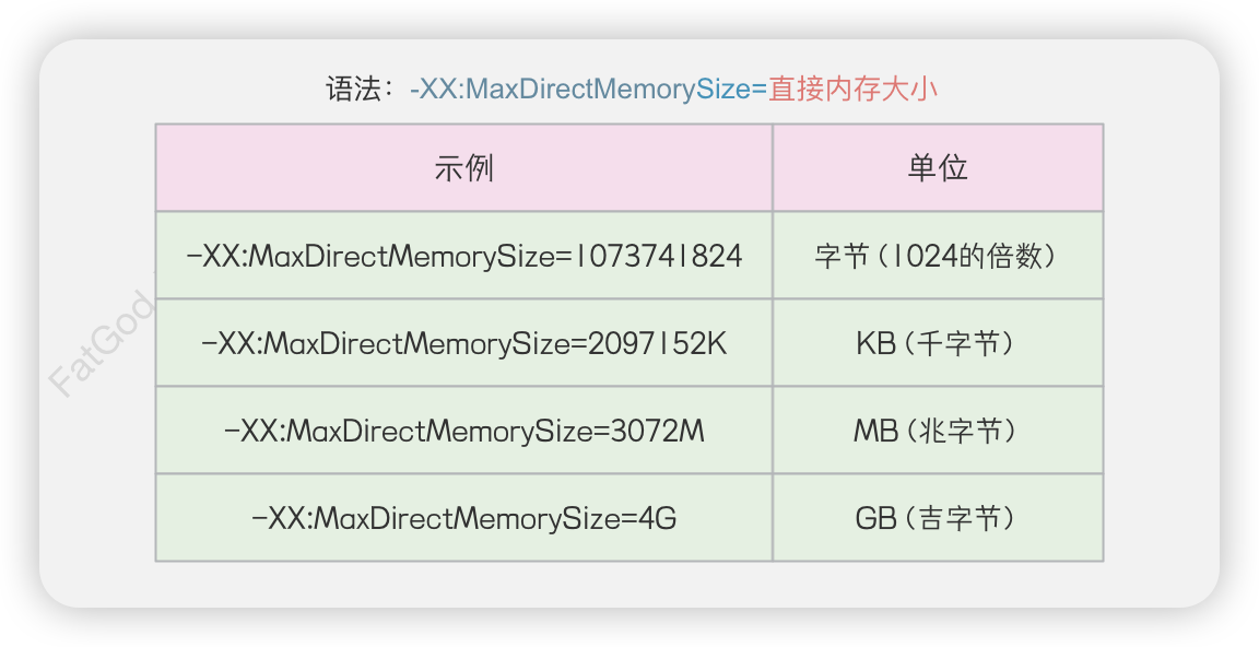 默认情况下,直接内存分配的上限为操作系统可以承受的上限。然而,Java应用部署的环境中可能存在其他应用程序,此时为了防止单个Java应用占用过多系统资源,导致内存耗尽的情况,我们可以通过设置虚拟机参数-XX:MaxDirectMemorySize来手动调整Java应用的直接内存上限(最大值),参数语法如下。