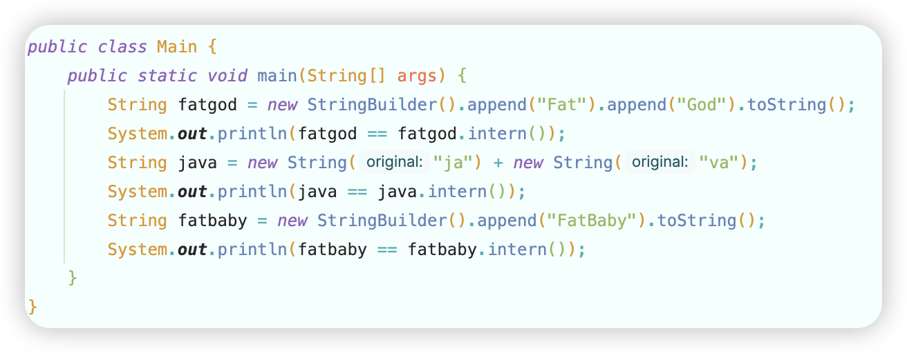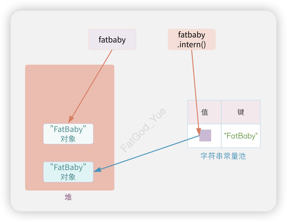 "FatBaby"的引用。在第行代码执行后,新新的字符串对象 "FatBaby"会被创建并存储在堆中。调用新的字符串对象"FatBaby"的intern方法会直接返回池中一开始就持有的字符串对象"FatBaby"的引用,因此第行代码执行后将输出 fasle。