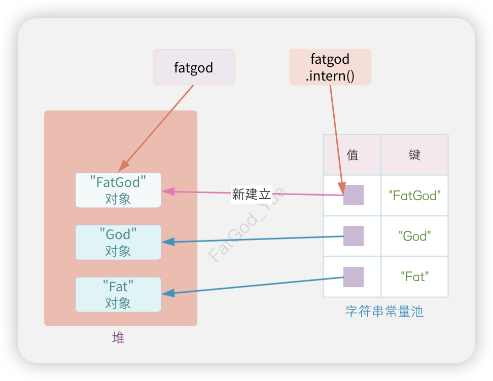 "Fat"和"God"的引用。在第行代码执行后,字符串对象 "FatGod"会被创建并存储在堆中。调用字符串对象"FatGod"的intern方法会使池中新增一个对其自身的引用,并返回该引用,因此第行代码执行后将输出 true。
